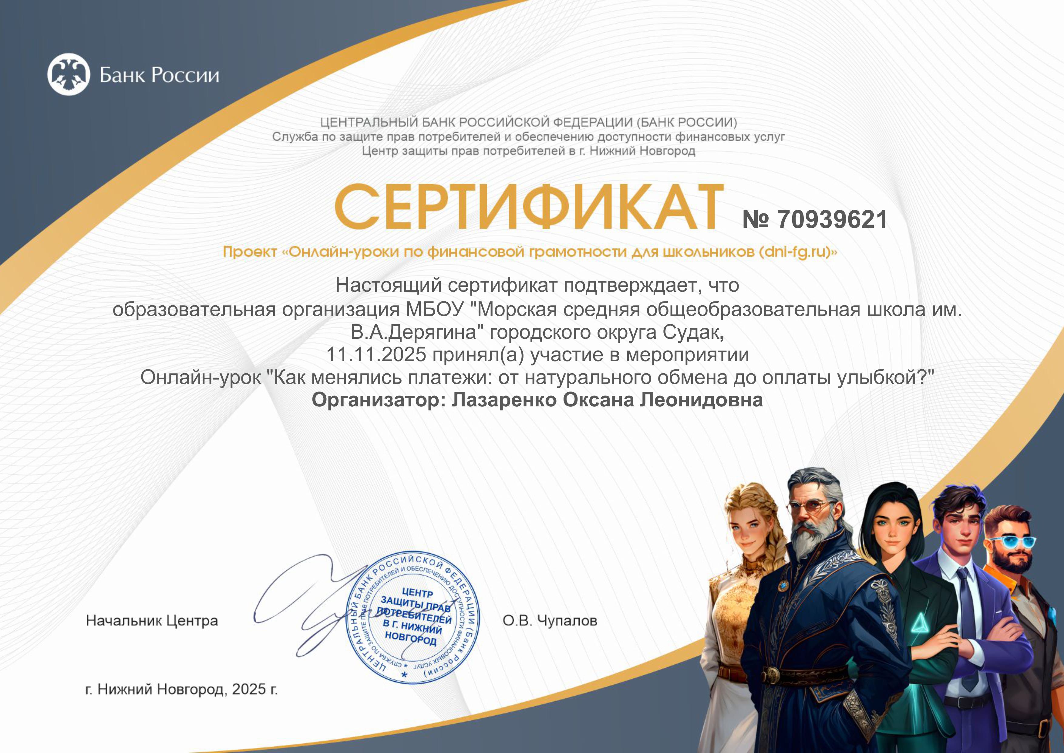 Сертификаты по Всероссийскому онлайн- зачету по финансовой грамотности от 14.10.2025г.